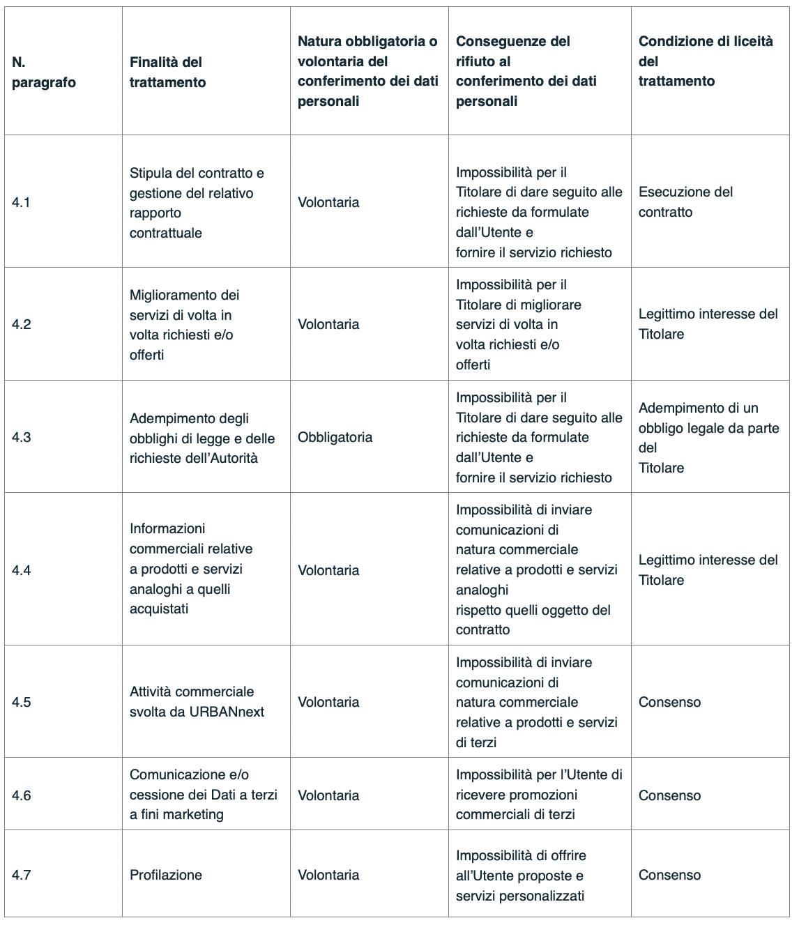 In conformità con il dettato dell’art. 13 GDPR, riepiloghiamo nella seguente tabella le finalità di trattamento cui sono destinati i Dati, nonché la natura obbligatoria o volontaria del conferimento degli stessi, le conseguenze di un rifiuto di comunicarli e la base giuridica del trattamento effettuato da URBANnext.